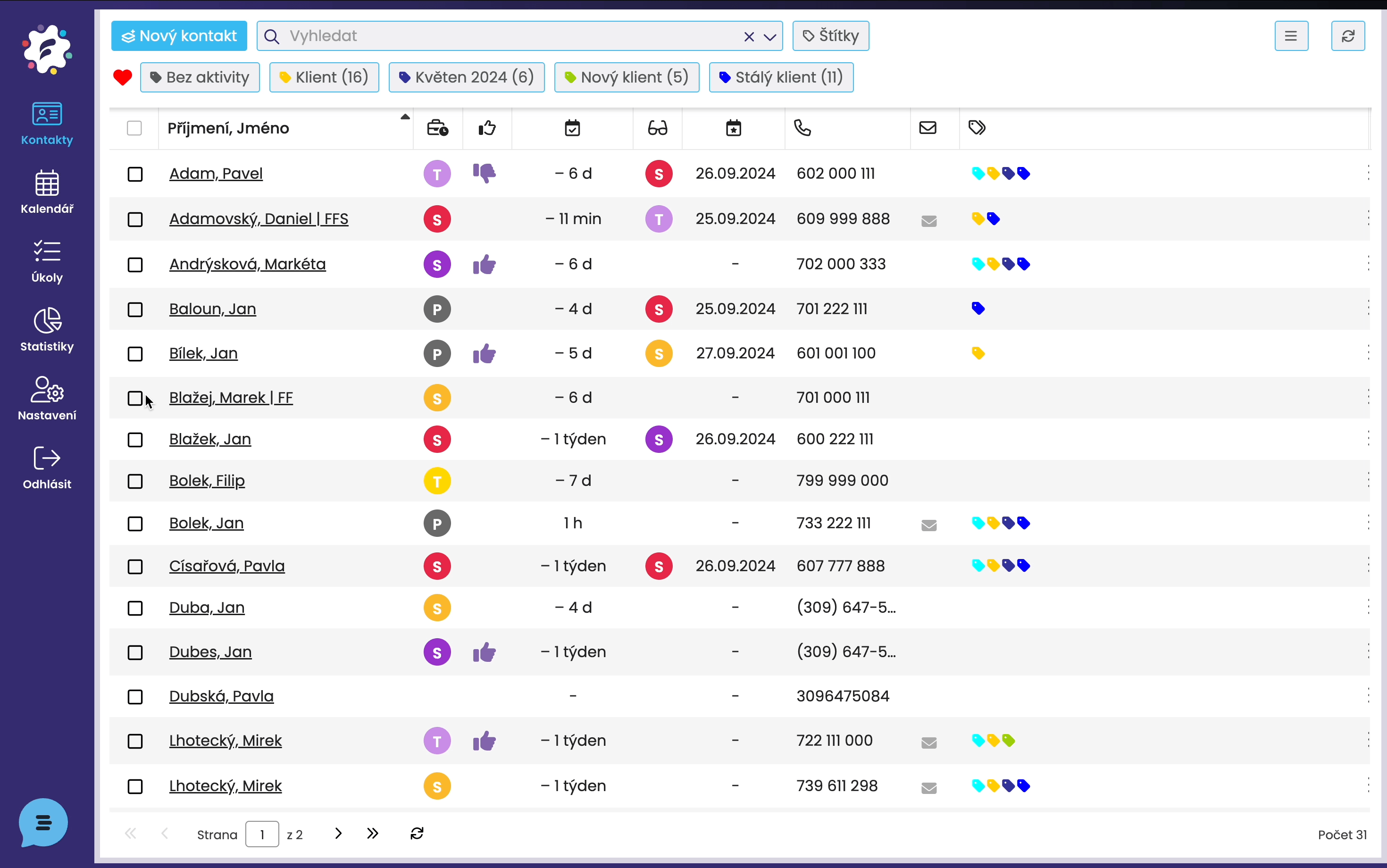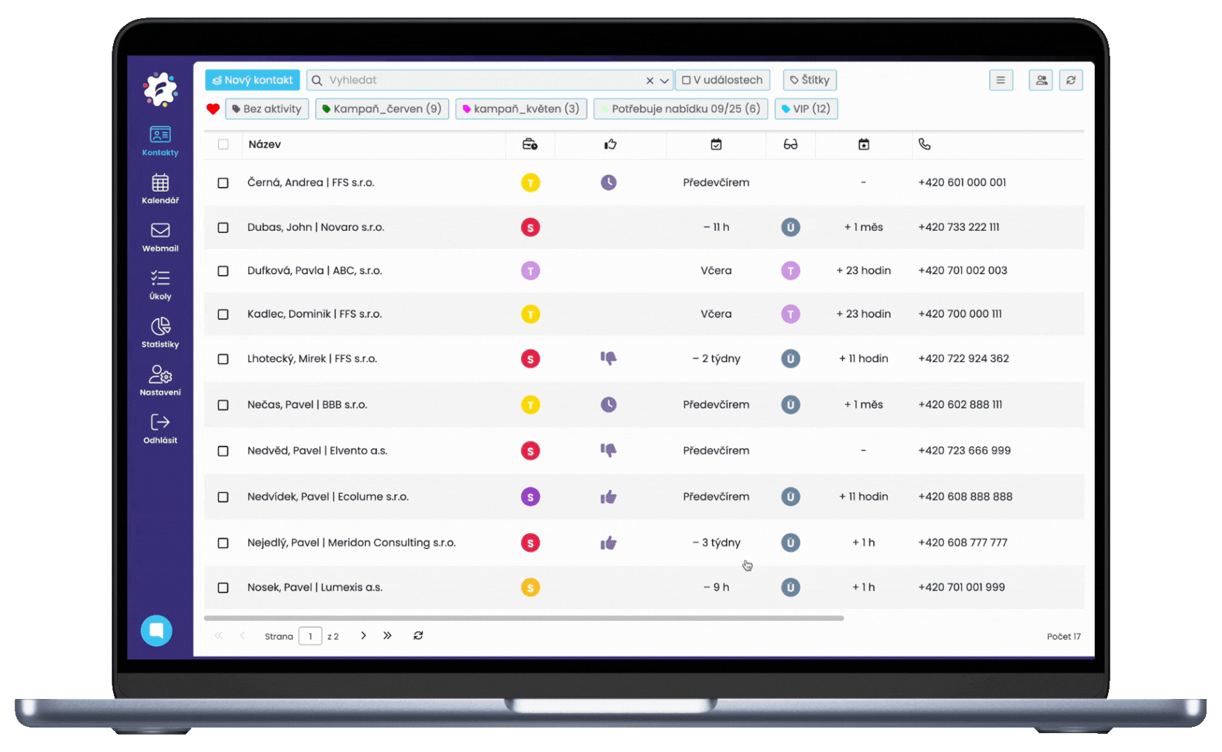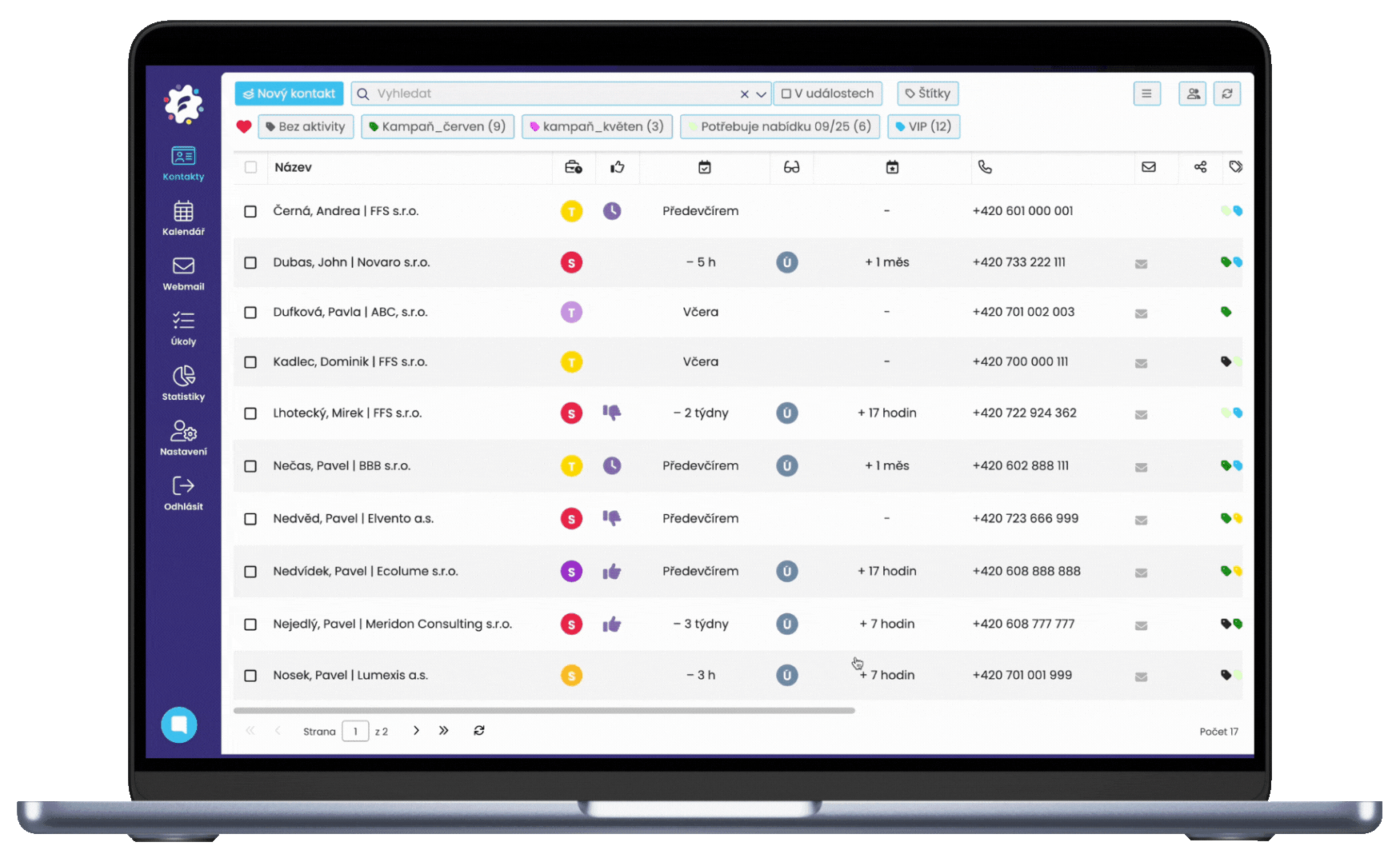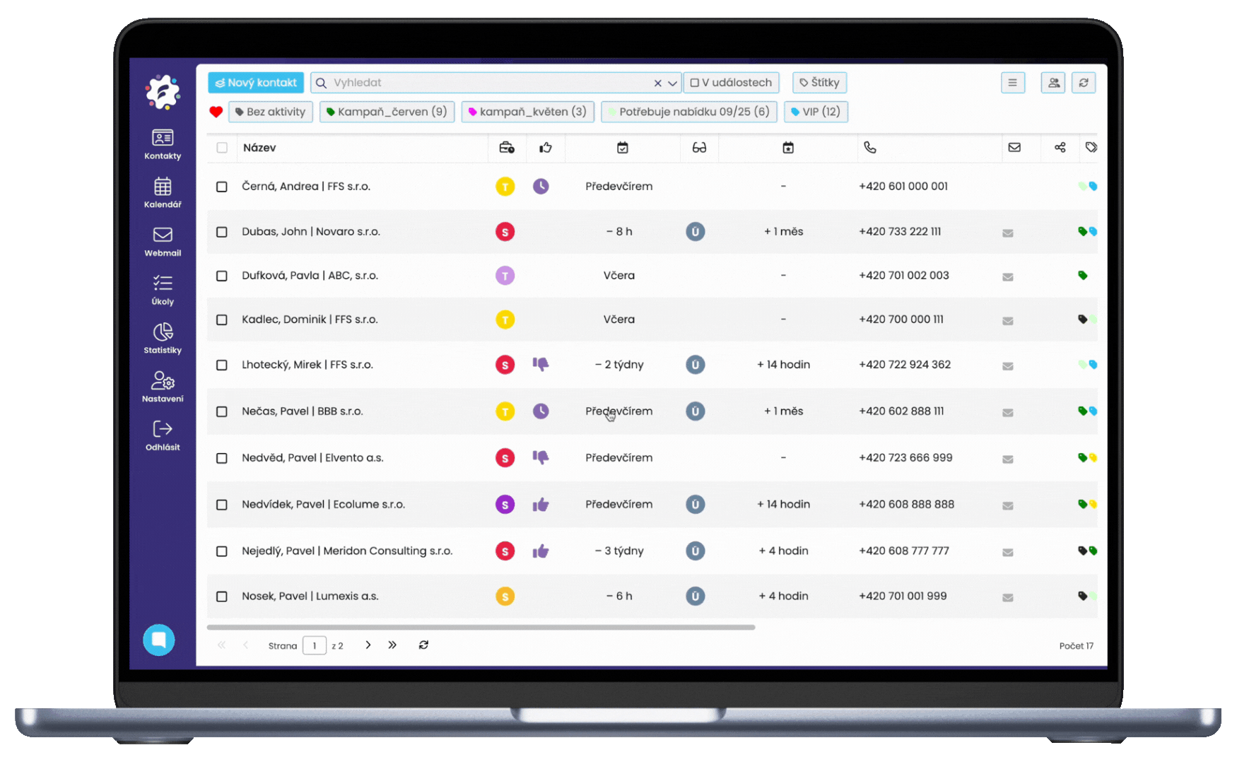 Díky třídění kontaktů například podle poslední aktivity, regionů, posledních výsledků aktivit či budoucích aktivit budete mít kompletní přehled o správných klientech a na pár kliknutí.