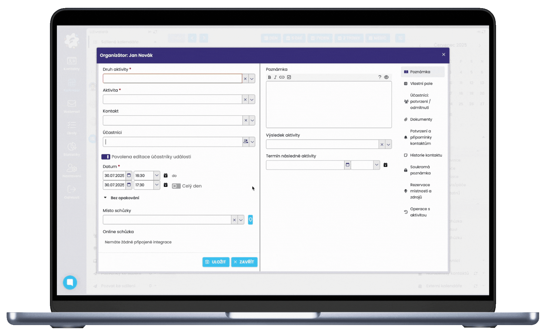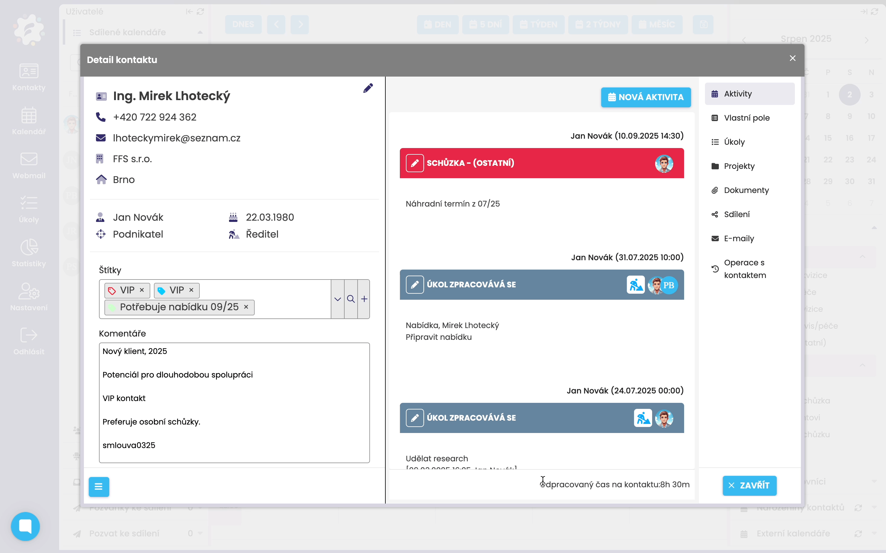 Vše se rovnou spojí s předcházející aktivitou propíše jak do sdíleného kalendáře, tak i do karty kontaktu (případně i do úkolů).
