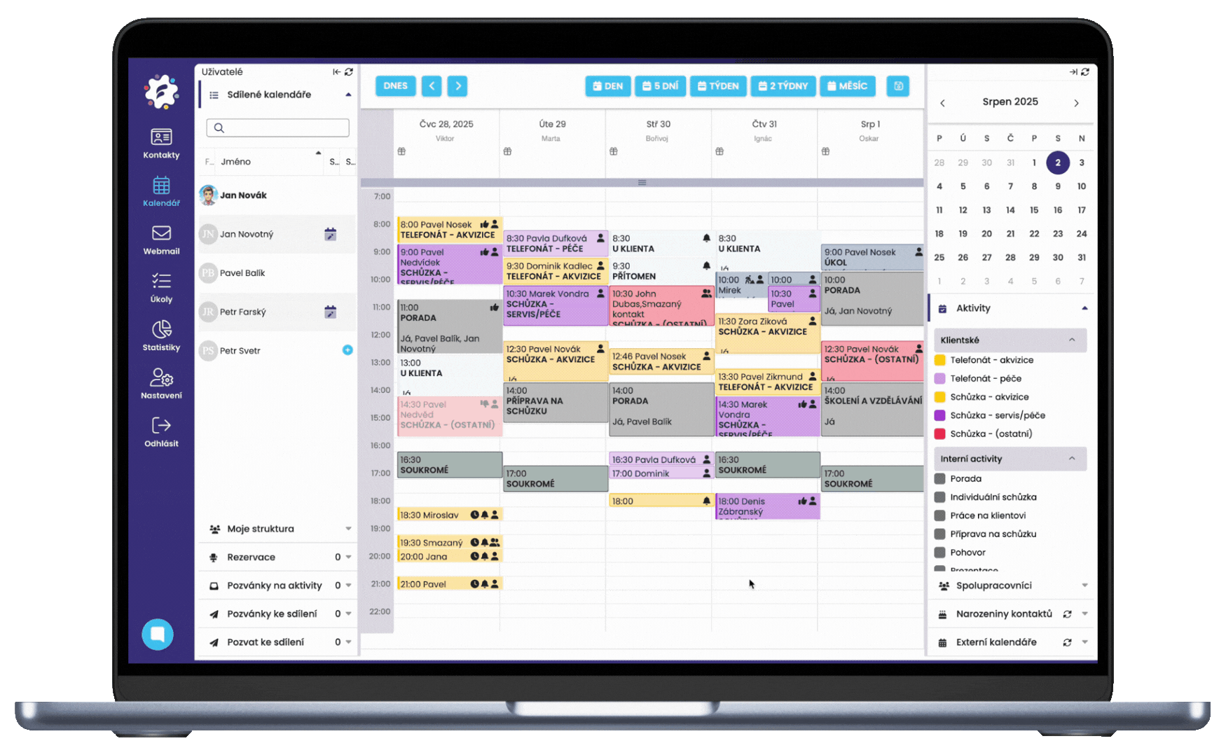 Máte tak jasný přehled o práci a výsledcích, ať už své, či například obchodníků ve Vašem týmu. Přehled získáváte nejen v kalendáři, ale i v kartě klienta mezi historií klientských aktivit.