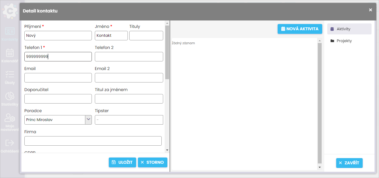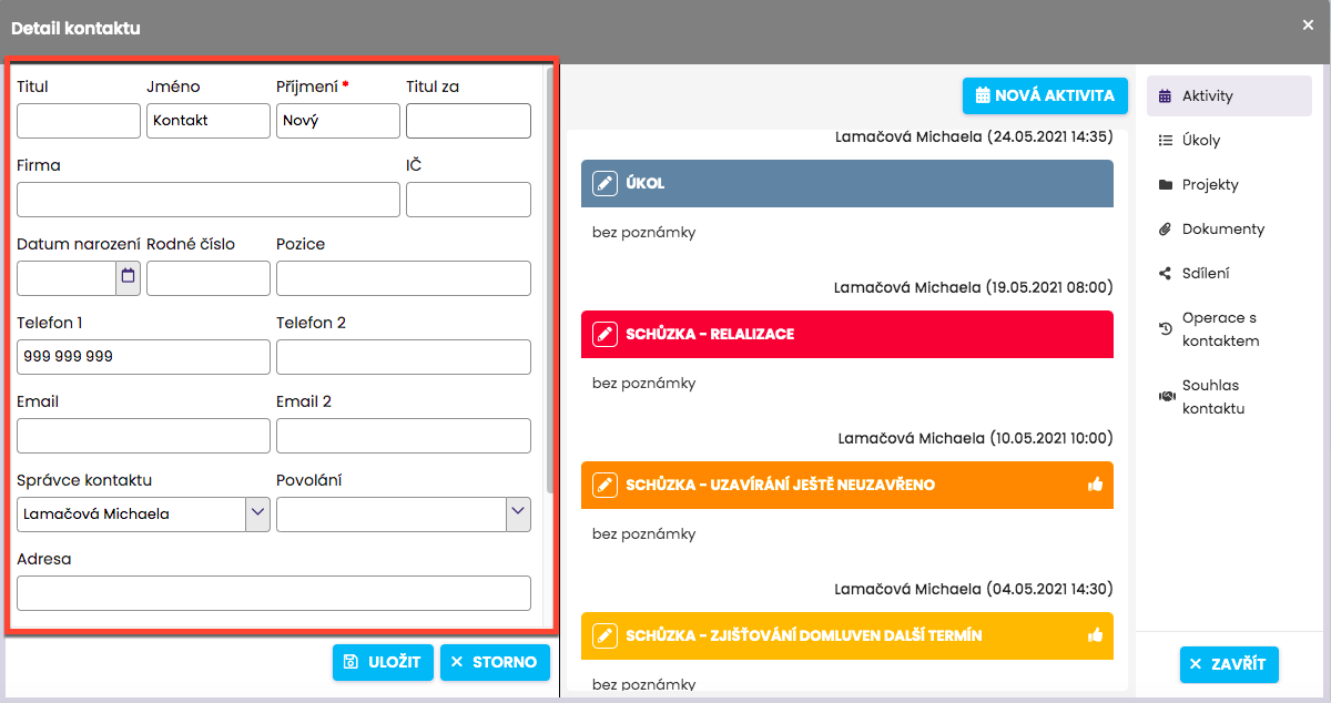 Po vložení si nové údaje uložte kliknutím na tlačítko “Uložit”, čímž se vrátíte na náhled detailu kontaktu.