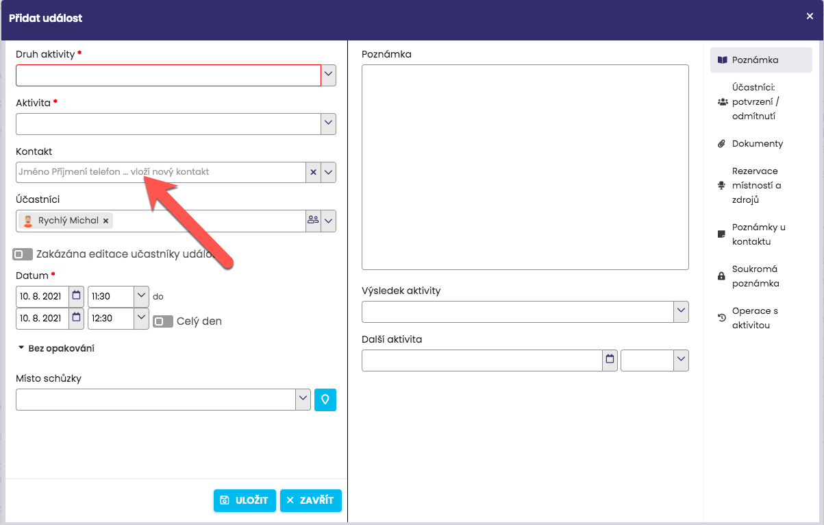 Po uložení události Kalendář nový kontakt zapíše do modulu Kontakty.