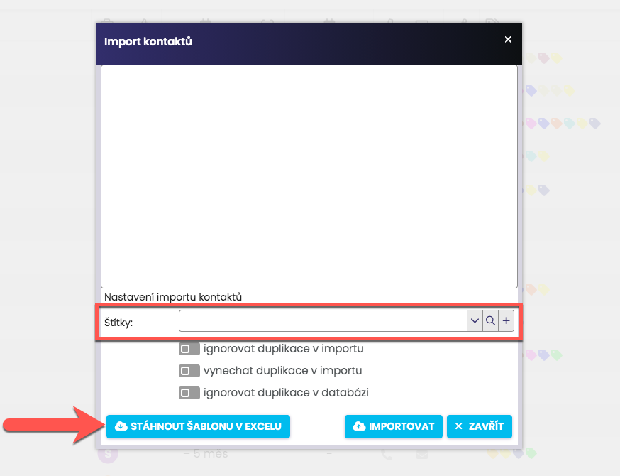 Po kliknutí se otevře dialogové okno pro import kontaktů, odkud si šablonu stáhnete:
