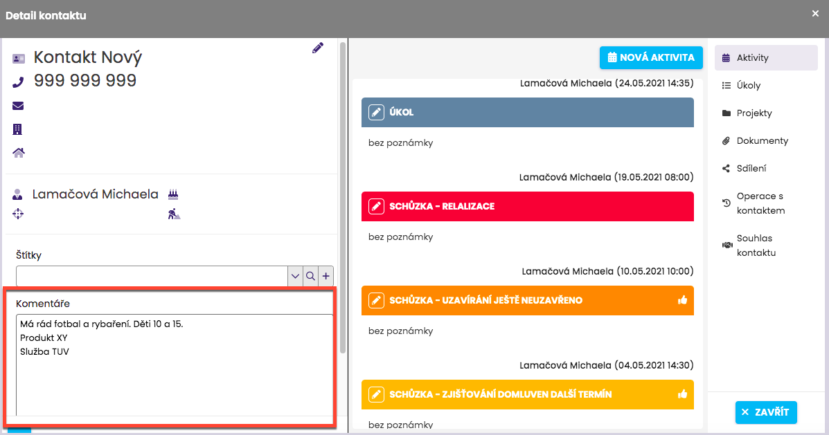 Některé informace si v detailu kontaktu můžete průběžně zapisovat (komentáře), některé se vám pouze zobrazí (poznámky u aktivit).