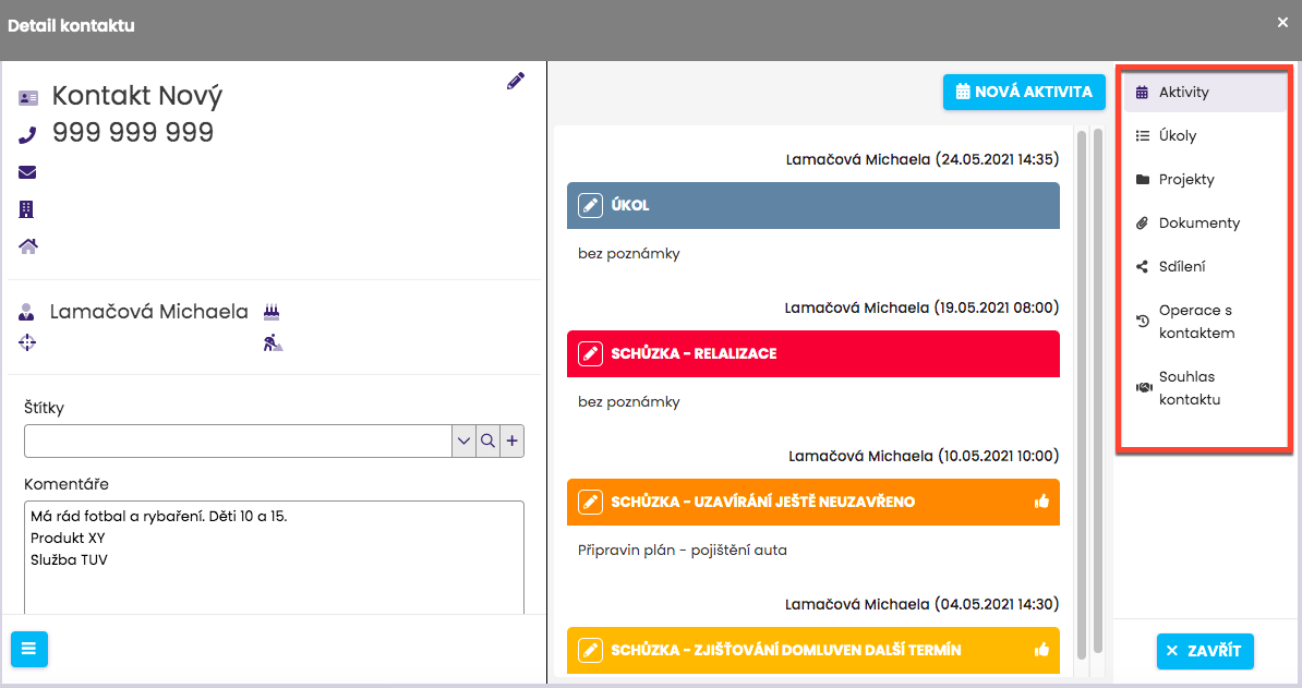 - Rychlý přehled – u kontaktu uvidíte historii aktivit, úkoly, vložené dokumenty a operace provedené s kontaktem.