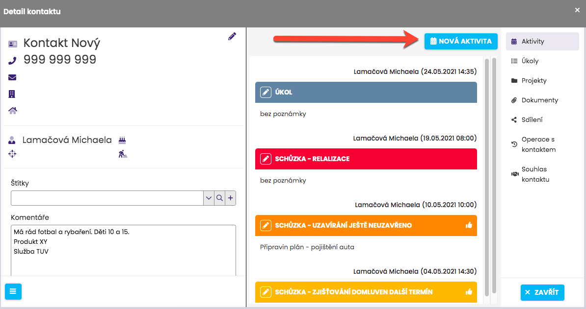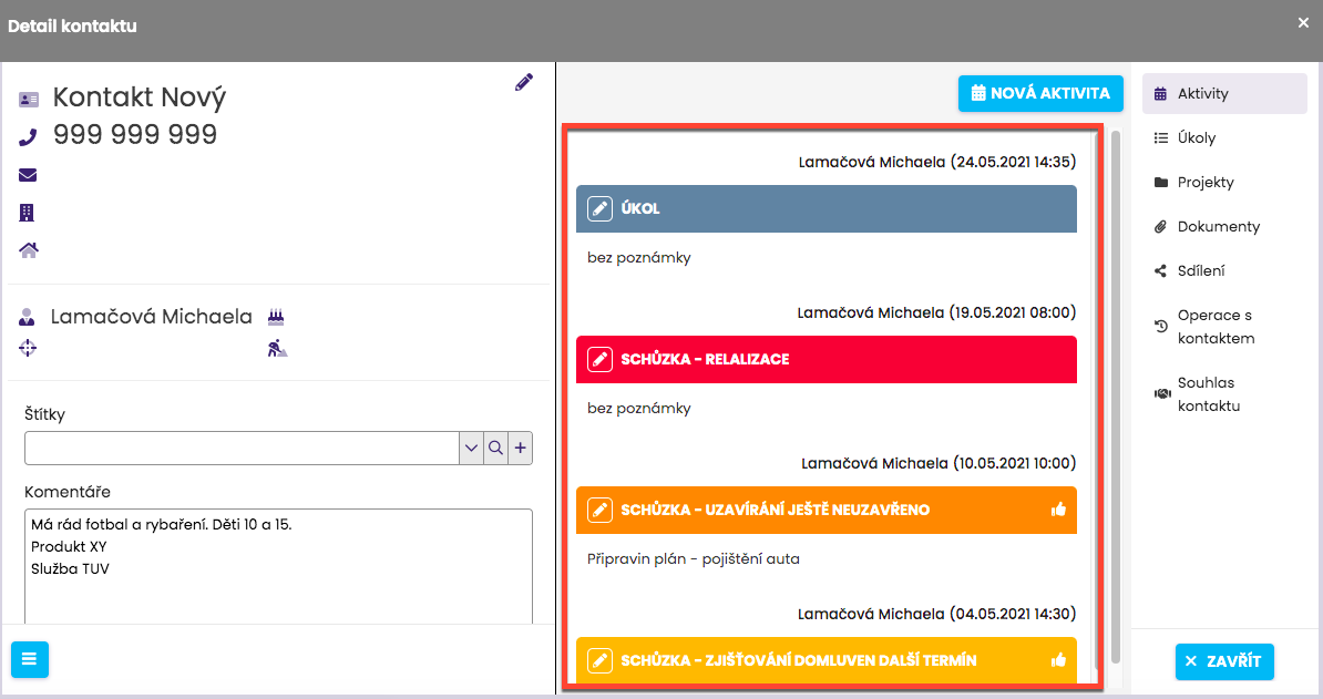 5. Historie aktivit a úkolů u kontaktu