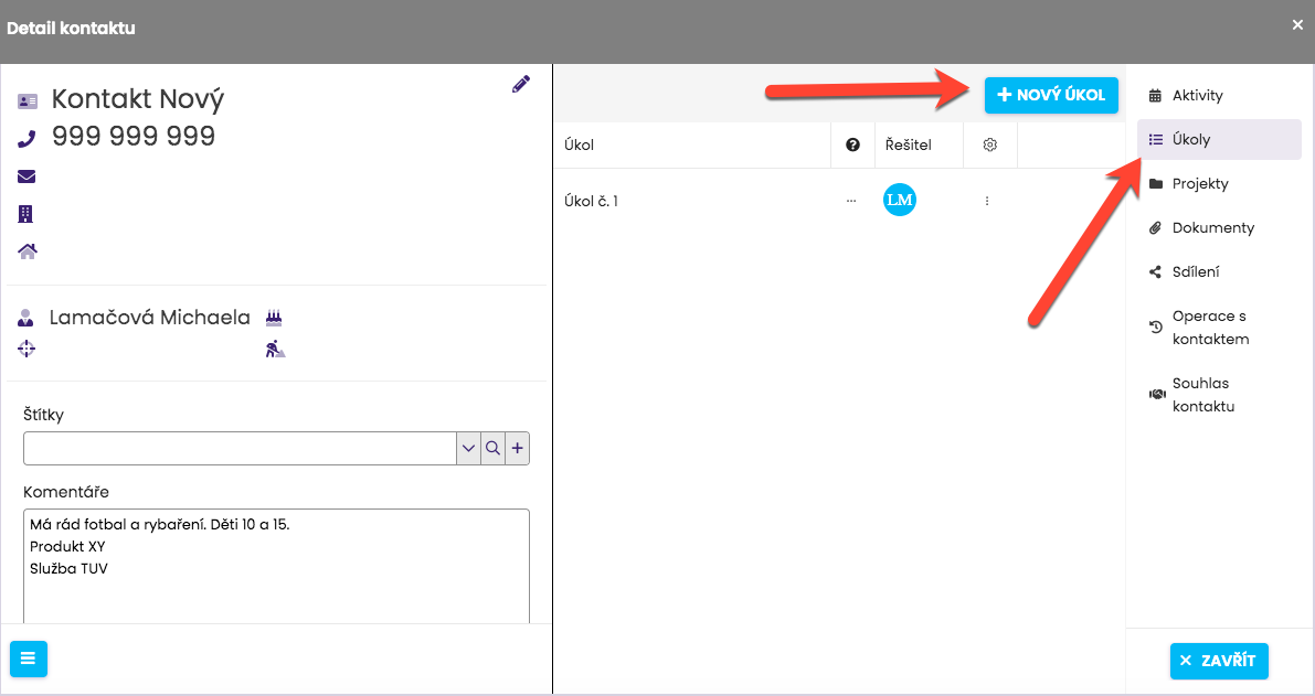 Navíc, jak vidíte z obrázku níže, v historii se zobrazují také úkoly, které jste si v souvislosti s daným kontaktem zadali.