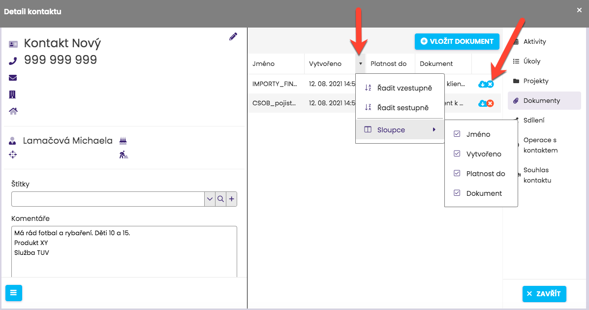 Výše jsme si ukázali, že v náhledovém okně detailu kontaktu můžete zakládat události, úkoly a projekty a vkládat dokumenty.