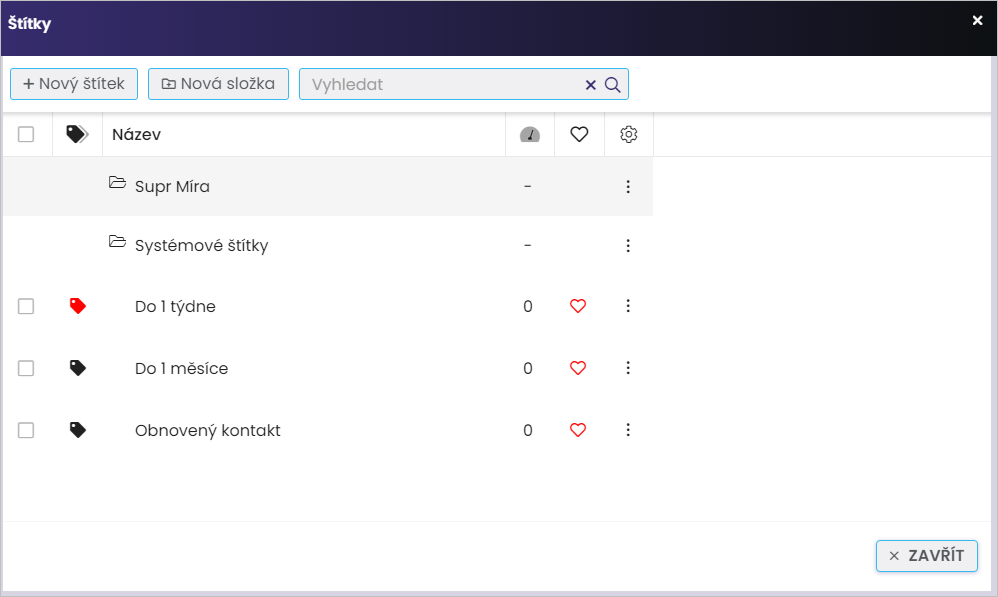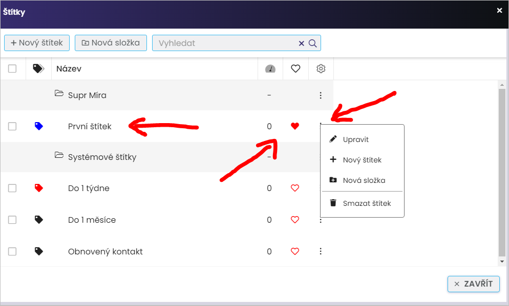Kliknutím na tlačítko “Štítky” si otevřete náhledové okno pro práci s nimi. Před tím si ještě všimněte, že si můžete několik štítků označit jako “oblíbené”, čímž si zrychlíte přístup k takto označeným kontaktům: