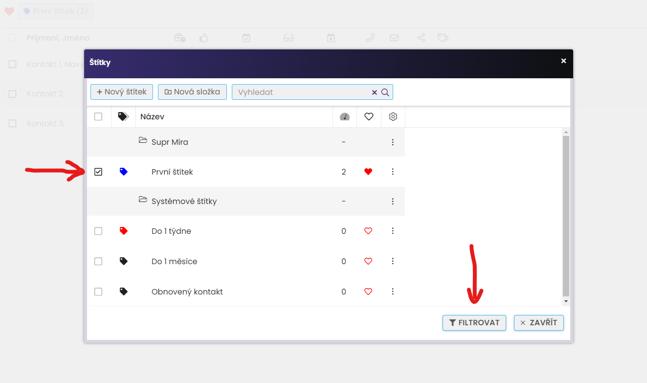 Kliknutím na tlačítko “Štítky” v horním menu si zobrazíte všechny štítky, které jste si založili a uložili do svých složek. V dialogovém okně si “zatrhněte” štítek nebo štítky, podle kterých chcete filtrovat a klikněte na tlačítko “Filtrovat”: