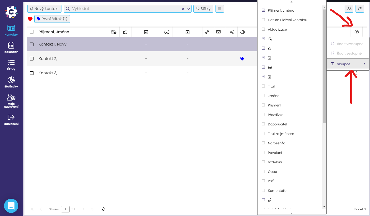 Pokud byste si v tomto dialogovém okně chtěli zobrazovat více nebo méně sloupců (položek ke kontaktu), můžete si je přidat nebo ubrat kliknutím na ikonu ozubeného kola vpravo nahoře.
