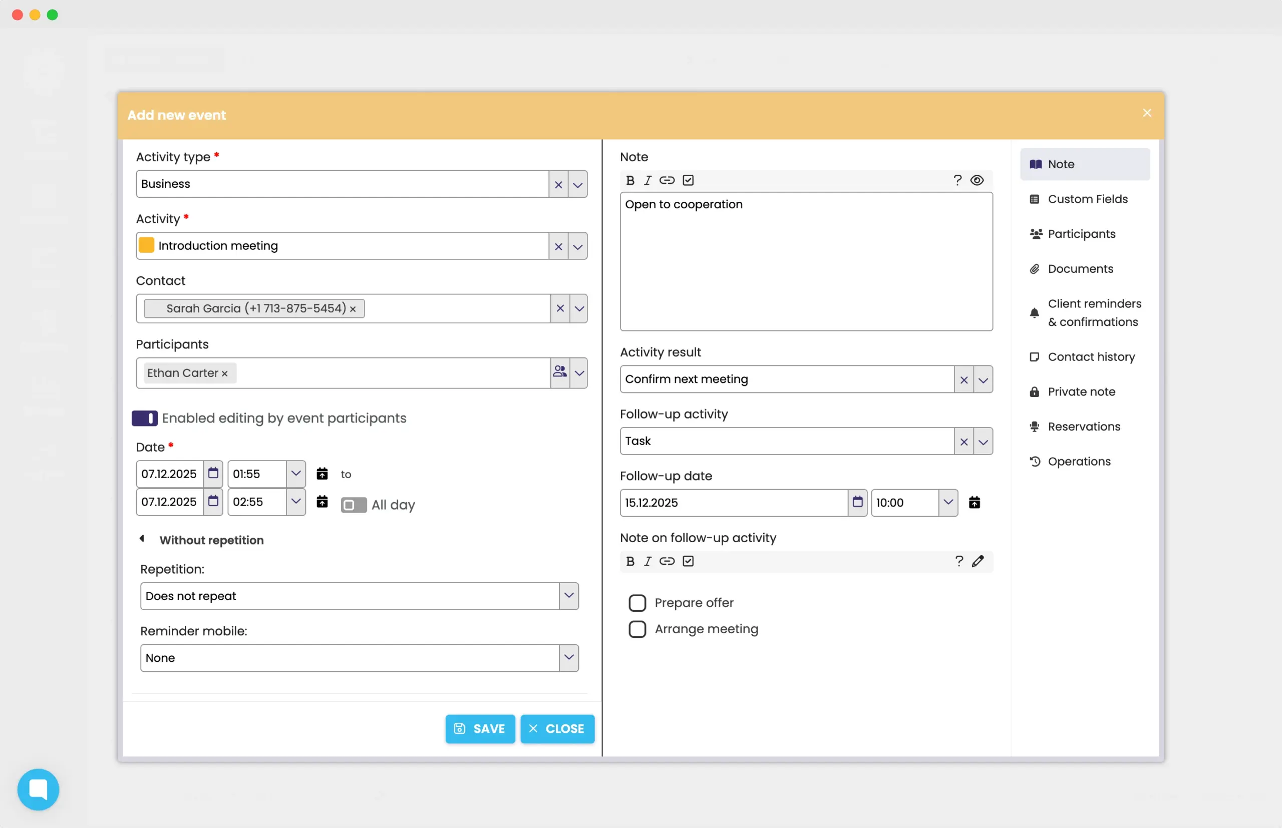 Each planned activity is automatically saved to a specific contact, included in statistics, and becomes part of the overview of team results and activities.
