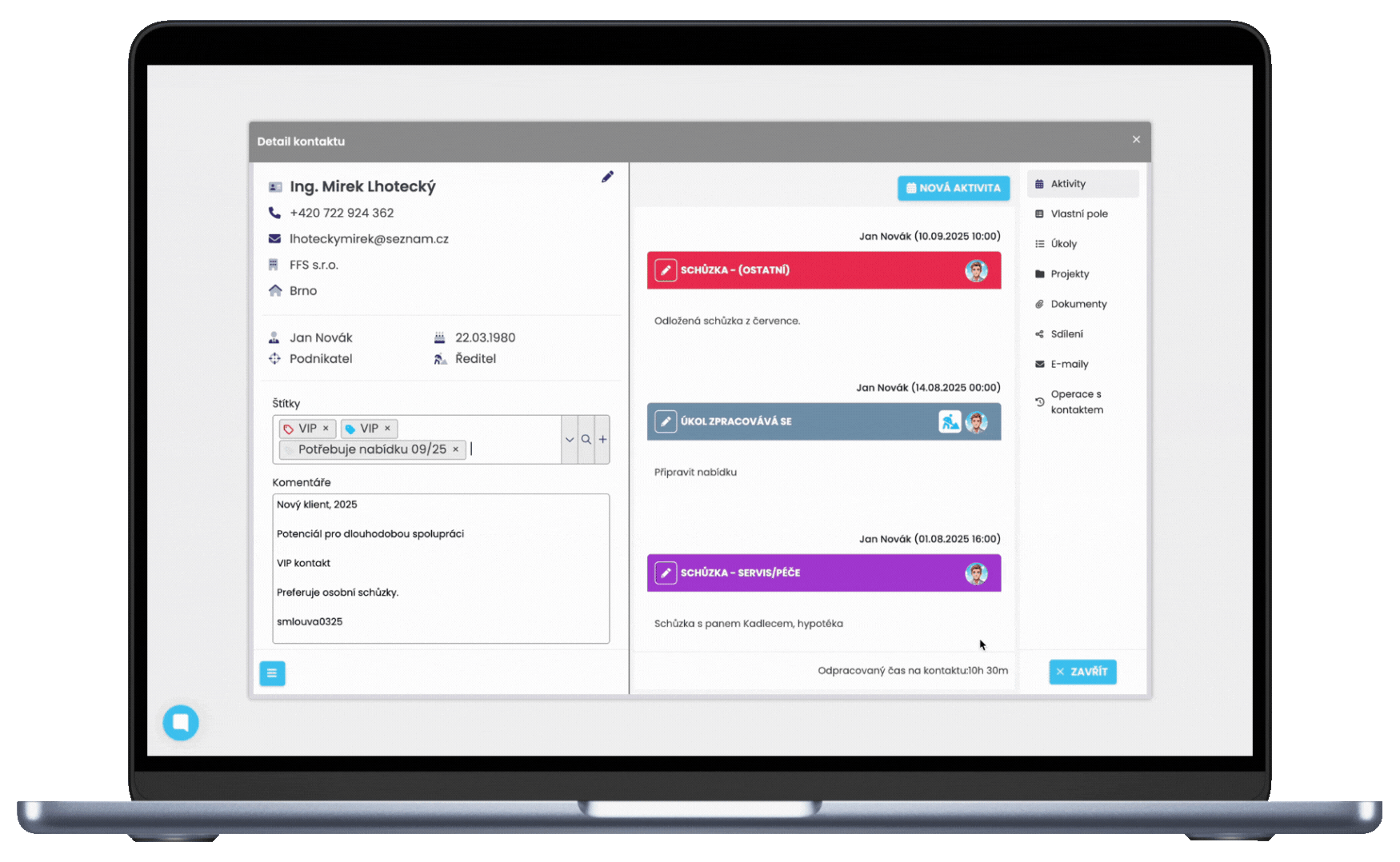 Fiecare contact are propriul profil unde este stocat întregul istoric al relației — întâlniri, apeluri, note, sarcini și rezultate.
