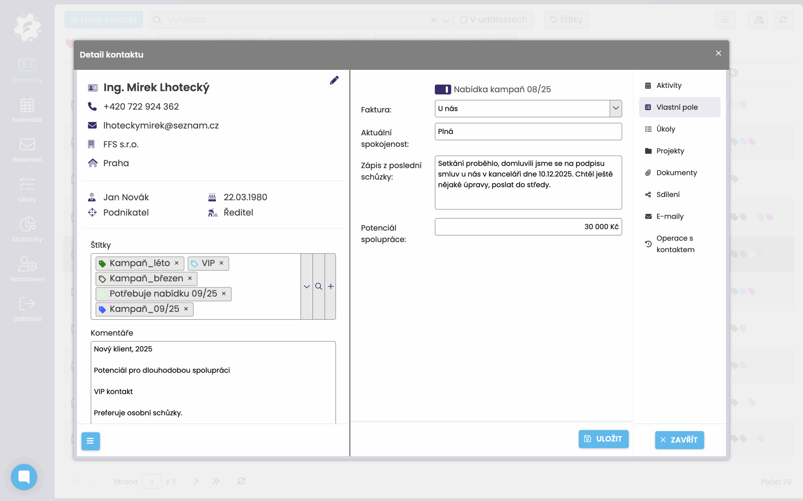 Môžete si napríklad viesť záznamy o preferovanom spôsobe kontaktu, počte zmlúv, odhade potenciálnych zákazníkov alebo frekvencii komunikácie. Vďaka rôznym typom polí máte úplnú voľnosť v tom, čo do kontaktu uložíte.